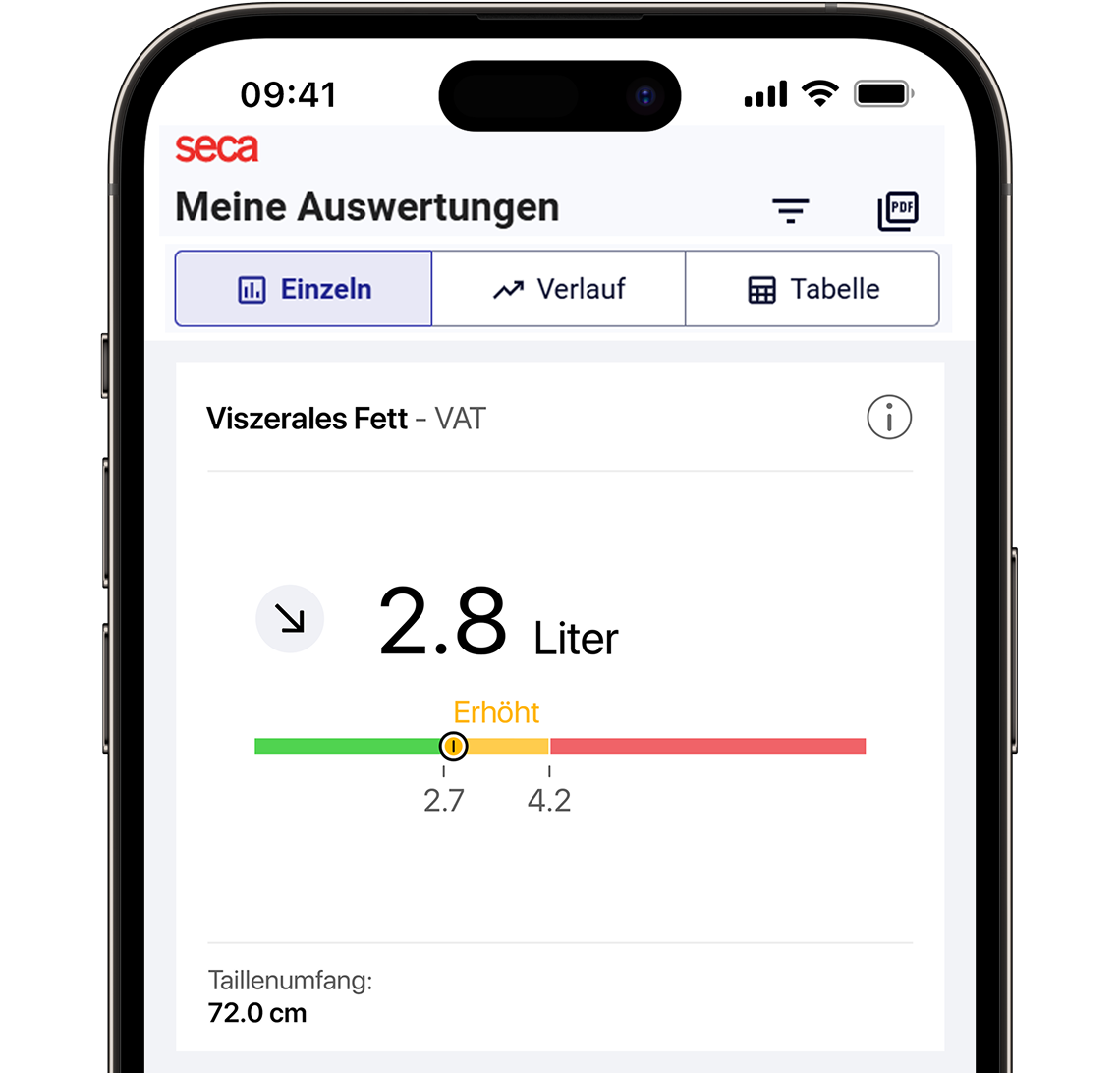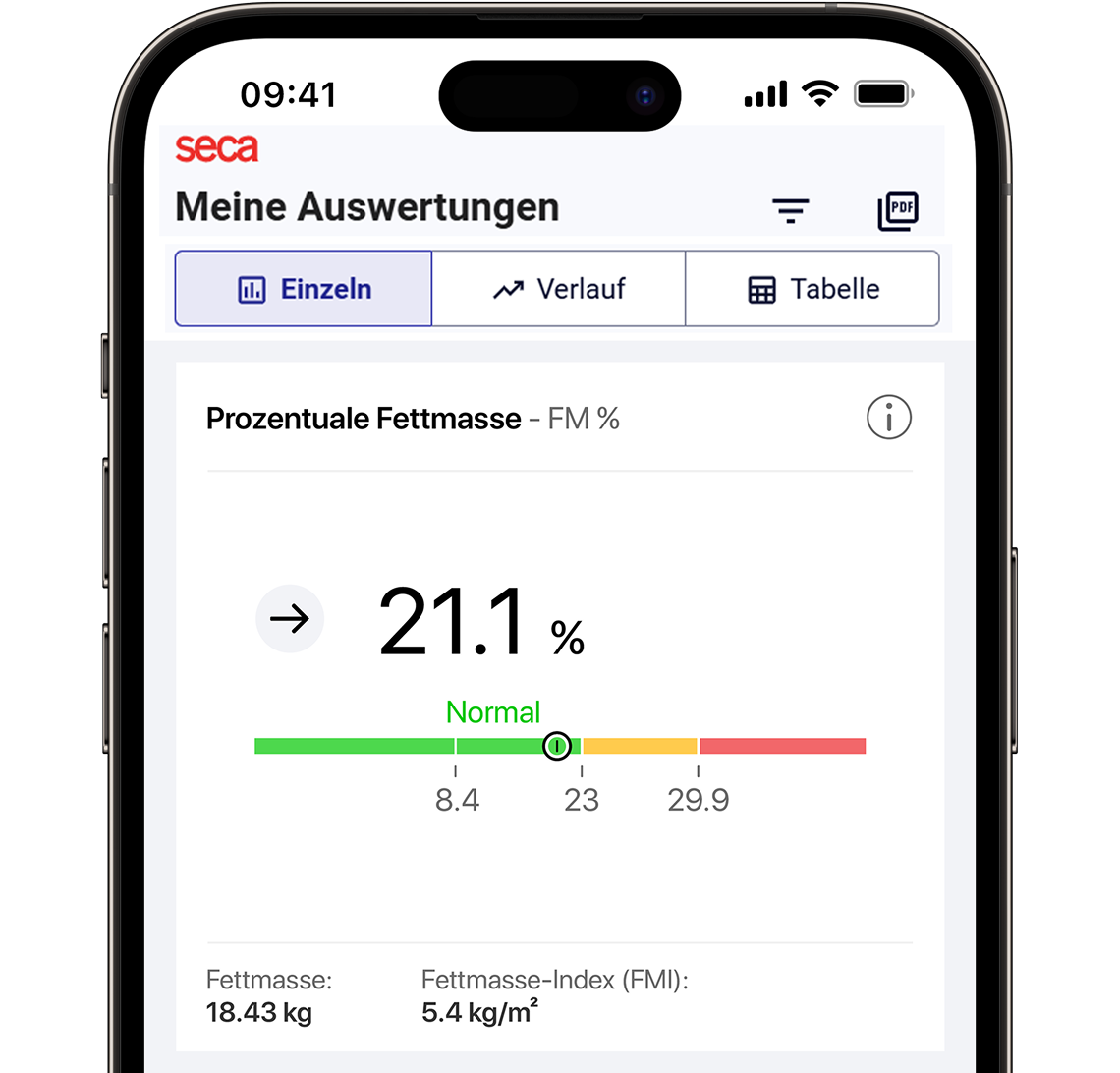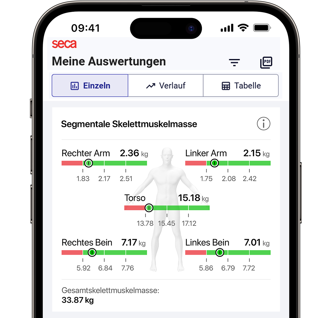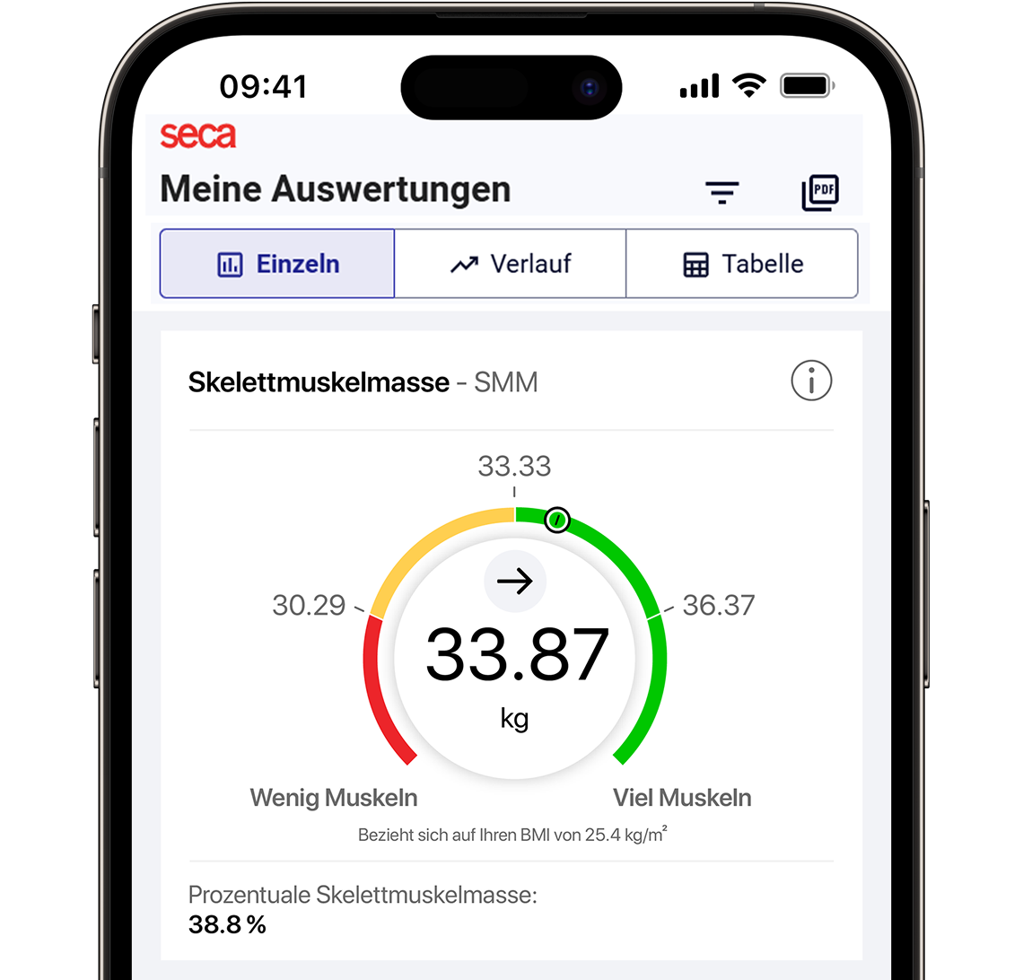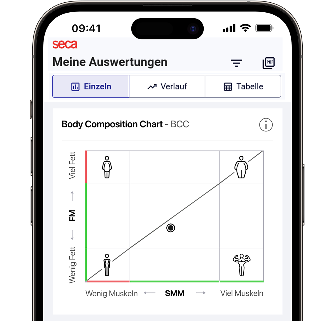 Wenn Sie noch weitere Fragen zu Ihrer Körperzusammensetzung haben, wenden Sie sich bitte an denjenigen, der Ihre Körperzusammensetzungsanalyse durchgeführt hat, also beispielsweise Ihren Trainer, Arzt oder Ernährungsberater. seca führt keine Beratung zur Körperzusammensetzung durch.