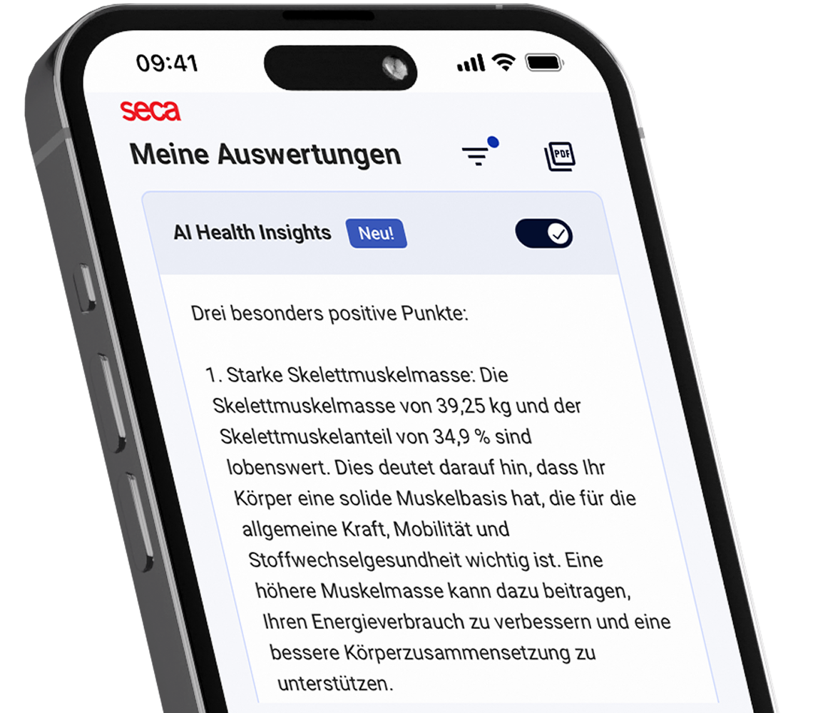 Wenn Sie diese Funktion in Ihrer App aktivieren, erhalten Sie eine erste personalisierte Einschätzung zum Stand Ihrer Körperzusammensetzung. Die Software bietet damit noch vor dem Arztgespräch eine Ad-hoc-Bewertung der Ergebnisse inklusive Empfehlungen, wie sich die Gesundheit basierend auf einer Veränderung der Körperzusammensetzung optimieren lässt.