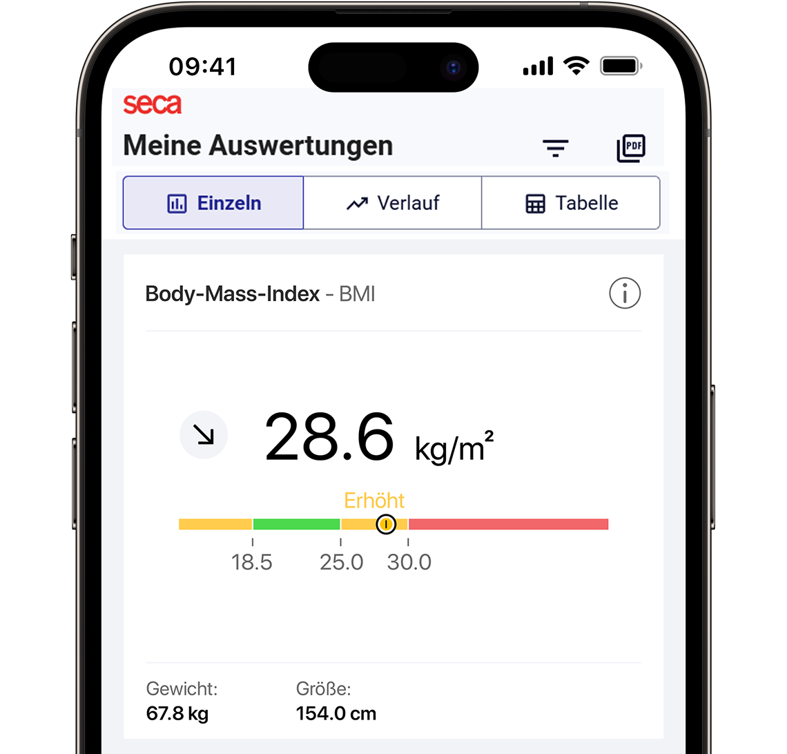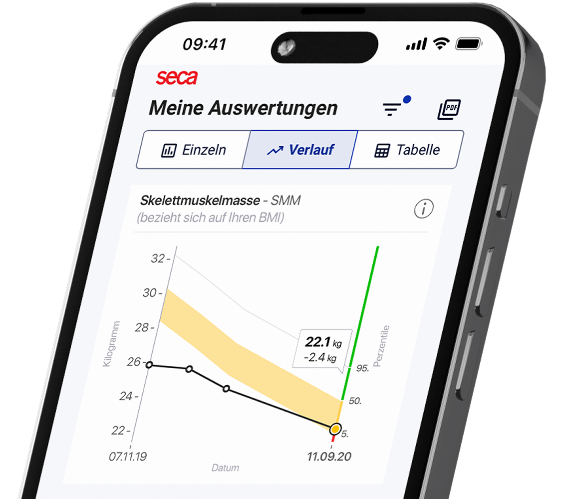 Sofern Sie die Messungen mit einem seca mBCA oder einer seca TRU vorgenommen haben, können alle Messergebnisse in einem Login der seca myAnalytics angezeigt werden. Wechseln Sie beispielsweise das Fitnessstudio, können Sie Ihre Verlaufsmessungen in dem neuen Studio fortführen, solange es mit einer seca TRU oder einem seca mBCA ausgestattet ist.