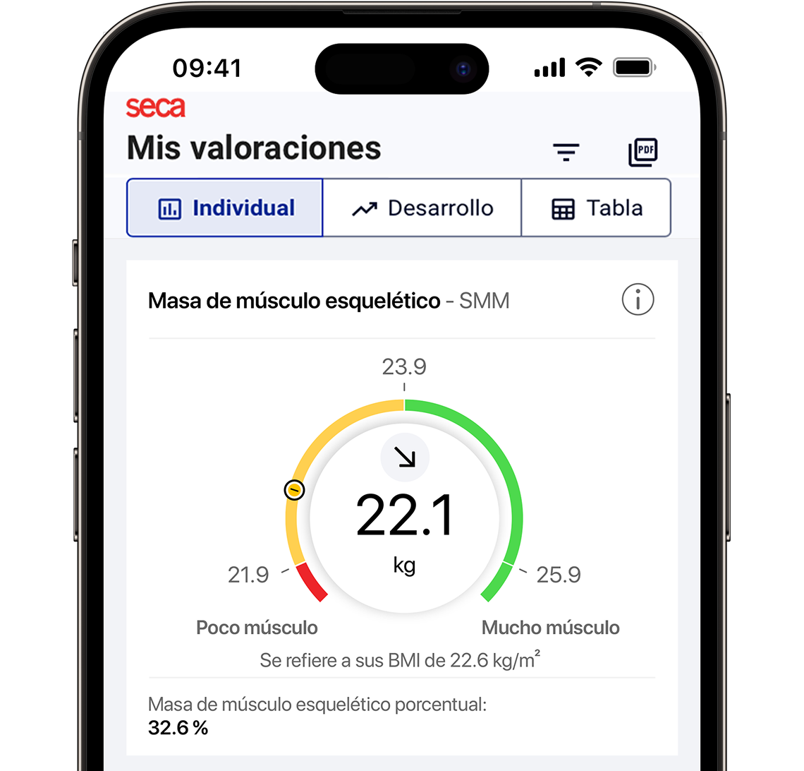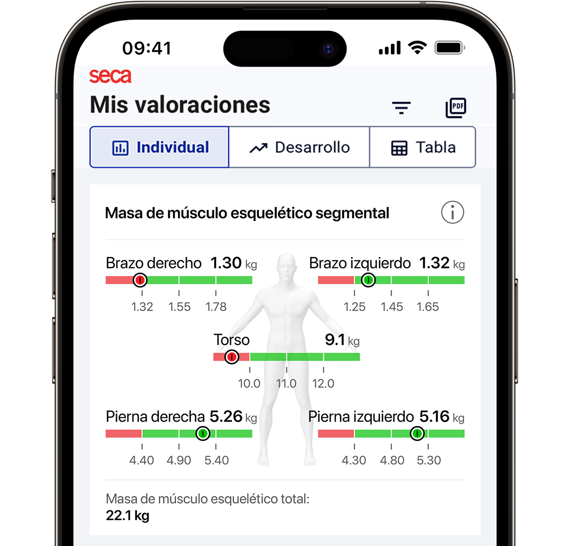El seca mBCA determina la masa muscular por brazo, pierna y parte superior del cuerpo. De este modo puede ver si existe un desequilibrio en la distribución de la masa muscular, como una musculatura del tronco o de las piernas demasiado débil. También pueden detectarse diferencias entre la parte superior e inferior del cuerpo, así como entre el lado izquierdo y derecho.