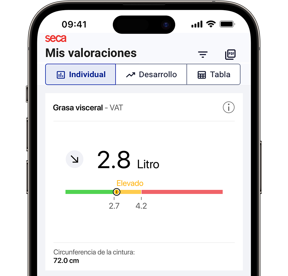 Una medición con seca mBCA le permite ver más allá del número en la báscula. En solo unos segundos podrá saber si su masa muscular está en el rango saludable o si ha acumulado grasa visceral (la grasa abdominal invisible que rodea los órganos). Ambos valores son claves para su salud, bienestar y prevención..