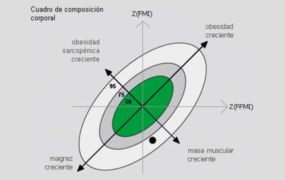 Los niveles bajos de masa grasa también se pueden observar en la GCC, donde el punto de medición se encuentra fuera del 75º porcentaje. La elevada masa libre de grasa, por encima del promedio, se reconoce debido a que el punto de medición se desvía a la derecha. La posición indica una alta proporción de músculo