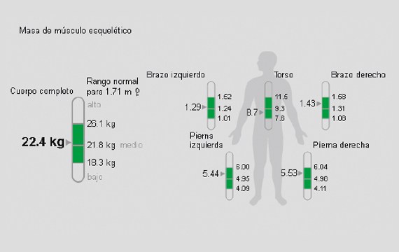Los resultados de la GCC se confirman aquí. La SMM está por encima del promedio. Además, es claro que las piernas tienen más músculo que los demás segmentos. Este estado físico es común en los corredores.