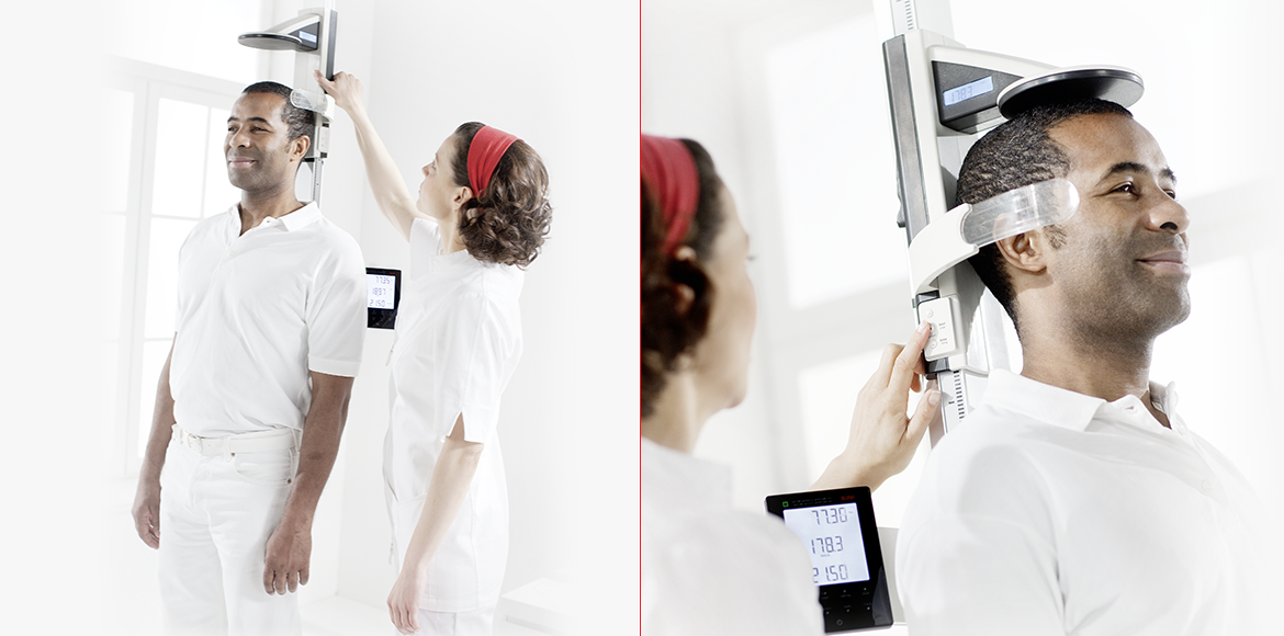 Otros puntos a favor: la bascule de alta capacidad integrada en la sólida plataforma de vidrio, el tope para los talones y la sólida corredera de medición con línea de Frankfurt, exclusivamente de seca, para el posicionamiento preciso de la cabeza. Además, se luce con dos pantallas: una para leer directamente la talla en la corredera de medición y la segunda, multifunción touch de tres líneas, que indica el peso, la talla y el BMI calculado automáticamente. Además, con una graduación muy fina en 50 g puede comprobar diferencias muy pequeñas en la evolución del peso.
