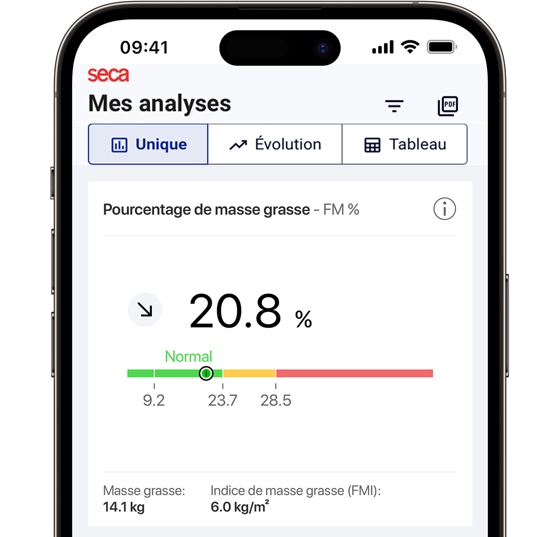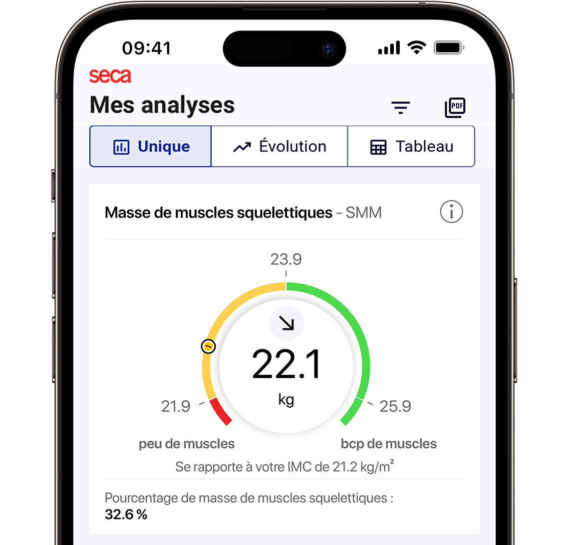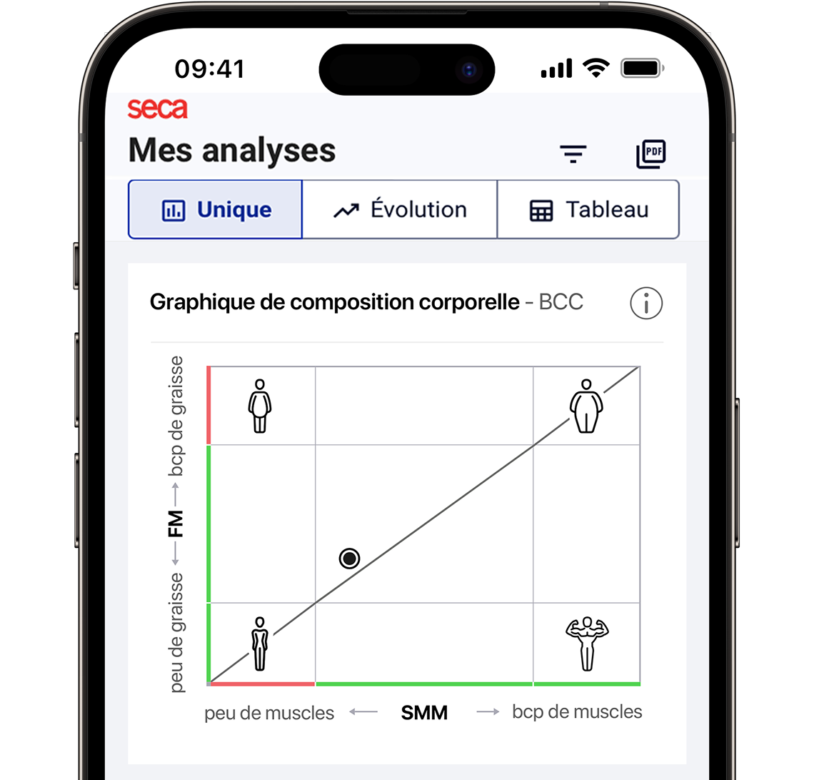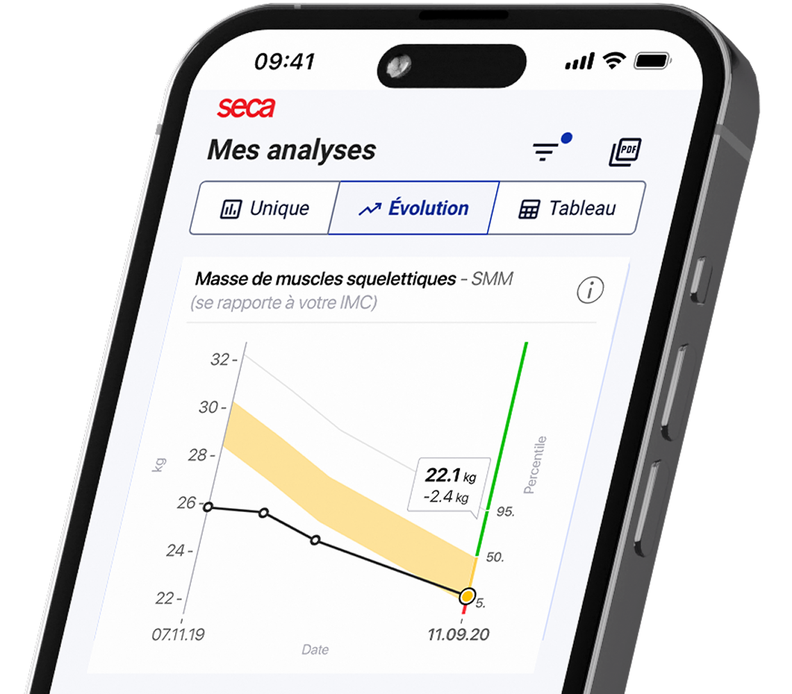 Grâce à l’application seca myAnalytics, vos résultats sont disponibles à tout moment, directement à portée de main. Vous percevez les évolutions d’un seul regard, suivez vos progrès en continu et bénéficiez d’analyses précises de votre composition corporelle – une véritable source de motivation à long terme et de changement durable.