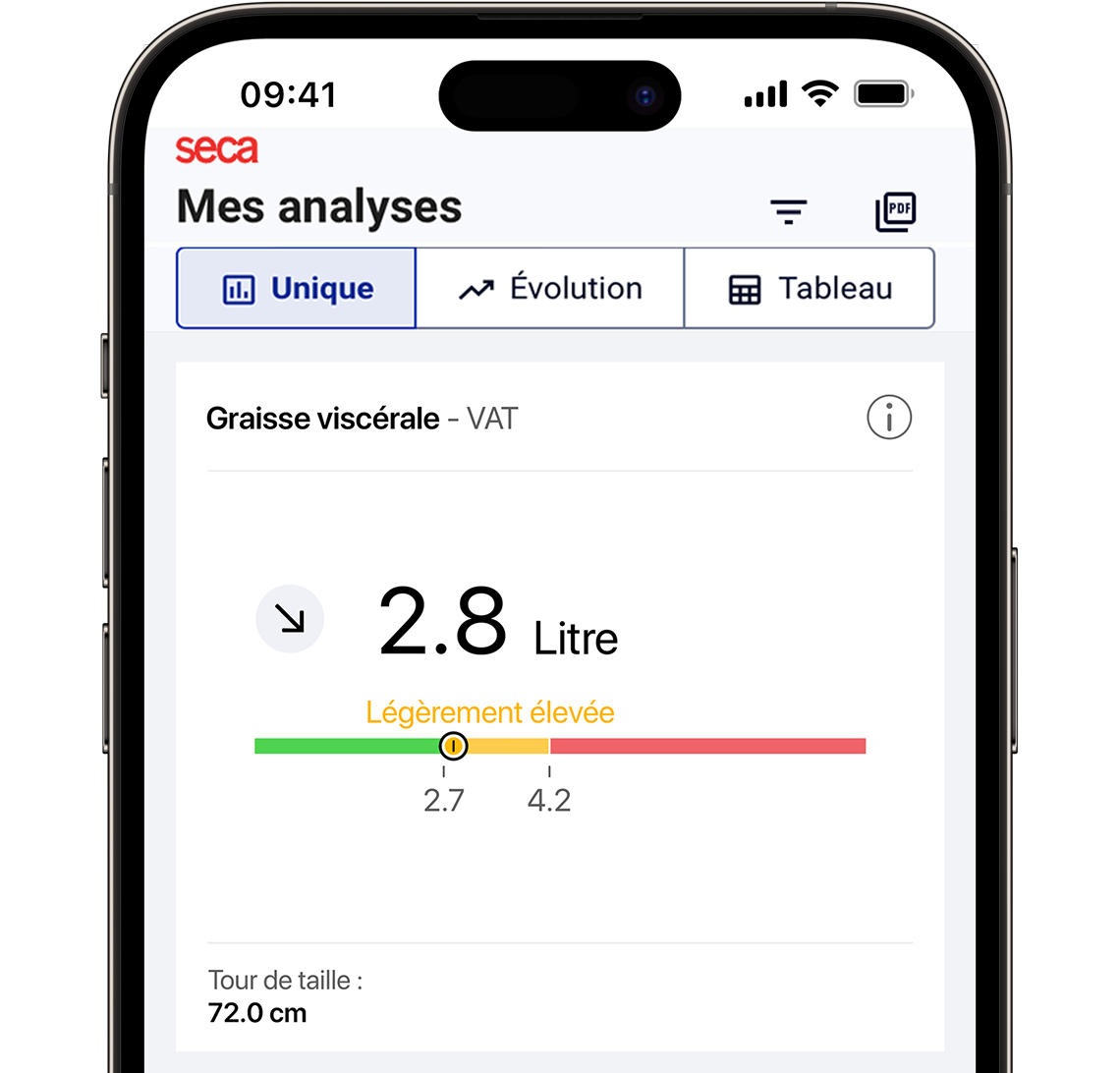 Une mesure réalisée avec le seca mBCA vous ouvre une fenêtre directe sur votre corps et fournit bien plus d’informations qu’une simple balance. En quelques secondes seulement, vous voyez si votre masse musculaire se situe dans la plage normale ou si une accumulation de graisse viscérale – cette graisse abdominale invisible – est présente dans la cavité abdominale. Deux paramètres essentiels pour la santé, la prévention et le bien-être.