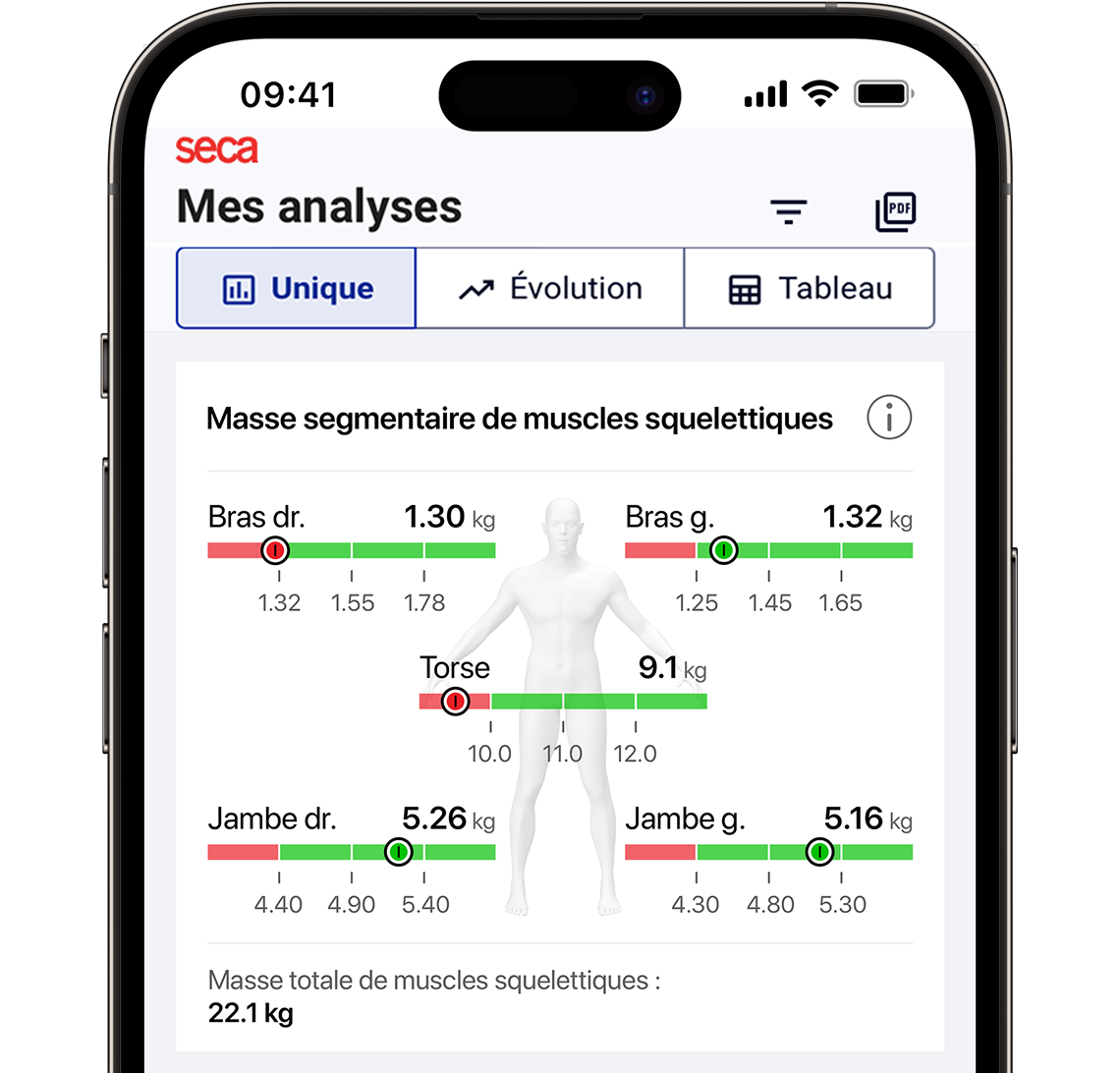 Le seca mBCA mesure la masse musculaire pour chaque bras, chaque jambe ainsi que pour le tronc. Vous pouvez ainsi identifier d’éventuels déséquilibres dans la répartition musculaire, par exemple une musculature trop faible du tronc ou des jambes. Des différences peuvent apparaître non seulement entre le haut et le bas du corps, mais aussi fréquemment entre le côté gauche et le côté droit.