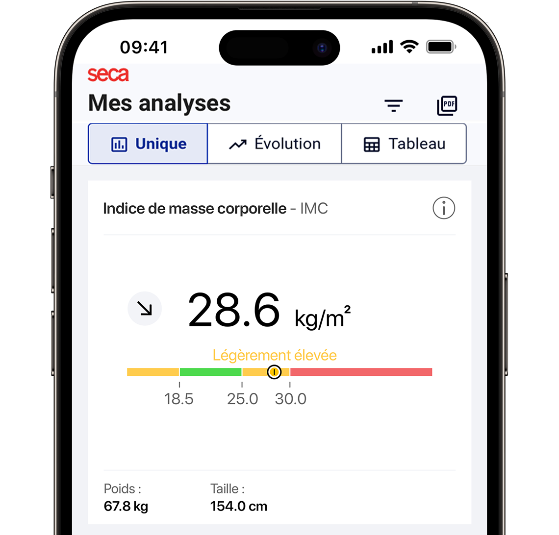 Si vous effectuez les mesures avec un seca mBCA ou un seca TRU, tous les résultats de mesure sont consultables en vous connectant à seca myAnalytics. Si vous changez de centre de remise en forme, vous pouvez poursuivre vos mesures par exemple dans votre nouveau centre de remise en forme, s’il est équipé d’un seca TRU ou d’un seca mBCA.