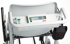 Wygodne siedzisko zapewnia bezpieczną pozycję, składane podłokietniki i wysuwane podnóżki sprawiają, że wyjątkowo przyjazna obsługa jest jeszcze przyjemniejsza. Blokowane tylne koła gwarantują bezpieczeństwo podczas siadania i wstawania. Umiejscowienie dużego wyświetlacza LCD za siedziskiem ułatwia intuicyjną obsługę licznych funkcji, takich jak TARA, HOLD i BMI. Ta mobilna waga krzesełkowa z zasilaniem elektrycznym lub bateryjnym jest bezcenną pomocą, czy to w rehabilitacji, ortopedii, na stacjach dializ, czy w domach opieki i zakładach leczniczych. Dzięki precyzyjnej 20-gramowej podziałce do 50 kg jest ona niezwykle praktyczna w pediatrii i na oddziałach dziecięcych. Tak na przykład, małe dzieci, które nie mogą stać, mogą być wygodnie ważone na siedząco. Praktyczny pokrowiec seca 471 służy do przechowywania zasilacza bezpośrednio na ramie wagi.